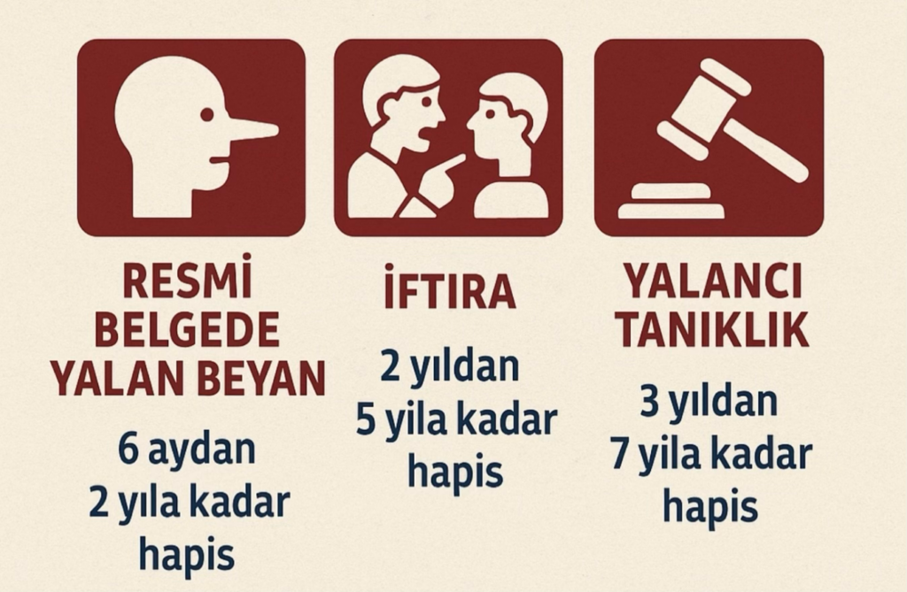 - Resmi belgeyi düzenleyen kişiyi yalan beyanla aldatmak (TCK m.206): Bir resmi belgeyi düzenleyen kamu görevlisine yalan beyanda bulunarak belgenin gerçeğe aykırı düzenlenmesini sağlamak, 6 aydan 2 yıla kadar hapisle cezalandırılır.